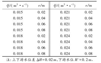 有限水域的浮體結構在不同來流動水中運行時,浮體結構位置的改變會對流場產(chǎn)生影響,從而影響浮體結構的泄流能力以及穩(wěn)定性。試驗過程中固定浮體結構的體型不變(長L=0.20m,寬B=0.30m,高a=0.10m),分別選取4種不同來流流量Q及浮體結構位置e,控制浮體結構在上、下游水位不變的條件下進行試驗,具體試驗參數(shù)設計及說明見表1以及圖2。
