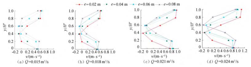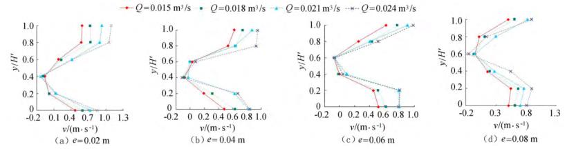 由圖5可知,當e相同時,斷面*小流速發(fā)生的位置相同,發(fā)生在浮體結構下游回流區(qū)位置。隨著來流流量的增大,流經(jīng)浮體結構下泄的水流流速在上層和下層水體中呈現(xiàn)增大的趨勢。浮體結構位置不變,由于受到浮體結構的擠壓,上游來流分別經(jīng)過浮體結構上部、下部進行泄流,因此在下游區(qū)域的上層、下層水體中,流速較大;受浮體結構的阻擋,浮體結構下游區(qū)域形成回流區(qū),流速較小。試驗過程中,由于控制浮體結構所在水域的上游、下游水位不發(fā)生變化,因此隨著來流流量的增大,流速呈現(xiàn)增大的趨勢。