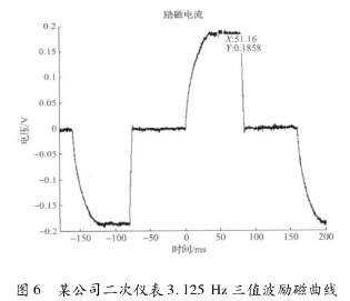 *先,采用某公司生產(chǎn)的二次儀表匹配一次儀表進(jìn)行勵(lì)磁。該二次儀表采用在H橋低端設(shè)置恒流晶體管進(jìn)行恒流控制的方法,其勵(lì)磁曲線結(jié)果如圖6所示,勵(lì)磁頻率為3.125Hz,勵(lì)磁方式為三值波勵(lì)磁,勵(lì)磁電流大約在51.16ms左右進(jìn)入穩(wěn)態(tài),勵(lì)磁電流穩(wěn)態(tài)段波動較大。