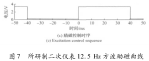其次,采用本文研制的二次儀表匹配一次儀表進(jìn)行勵(lì)磁。勵(lì)磁電流穩(wěn)態(tài)值設(shè)定為178mA,遲滯比較電路的閾值上限設(shè)定為205mA,閾值下限設(shè)定為165mA。方波勵(lì)磁頻率設(shè)為12.5Hz,低壓勵(lì)磁電源設(shè)定為17V。示波器采集繪制得到的勵(lì)磁結(jié)果曲線如圖7所示。其中圖(a)為勵(lì)磁電流曲線;圖(b)為恒流控制電路中,恒流源的輸入輸出端電壓幅值曲線;圖(c)為單路勵(lì)磁時(shí)序控制信號。從曲線(b)可以看到,在勵(lì)磁系統(tǒng)切換至低壓供電時(shí),由于三端穩(wěn)壓芯片的負(fù)載感抗較大,其輸出調(diào)節(jié)需經(jīng)歷過渡過程,待輸入輸出壓差穩(wěn)定后,勵(lì)磁電流隨后進(jìn)入穩(wěn)態(tài),進(jìn)入穩(wěn)態(tài)所需時(shí)間約為13ms。