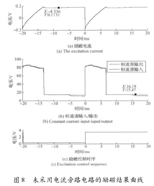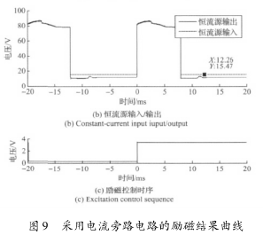 實(shí)驗(yàn)結(jié)果表明,高壓源向低壓源切換后,三端穩(wěn)壓器的工作特性致使的電流波動和低壓源供電情況下的恒流控制,會大幅延長勵(lì)磁電流的穩(wěn)態(tài)響應(yīng)時(shí)間。圖8所示勵(lì)磁電流約在17ms左右進(jìn)入穩(wěn)態(tài),圖9所示勵(lì)磁電流的穩(wěn)態(tài)響應(yīng)時(shí)間約為12ms。這表明,在采用三端穩(wěn)壓器搭建恒流控制電路的情況下,電流旁路電路能有效克服三端穩(wěn)壓器工作特性的影響,并能方便的實(shí)現(xiàn)電流超調(diào),加快勵(lì)磁電流的響應(yīng)速度。