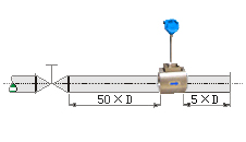 流量調節(jié)閥或壓力調節(jié)閥盡量安裝在傳感器的下游5D以遠處,若必須安裝在傳感器的上游,傳感器上游應有不小于50D的等徑直管段,下游應有不小于5D的等徑直管段。