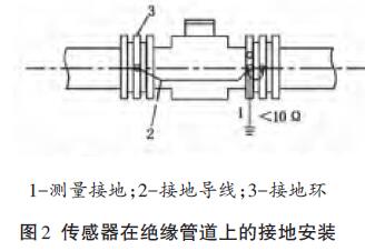 傳感器安裝在塑料管道或內(nèi)壁有絕緣涂層、襯里的管道上,兩端應(yīng)安裝接地環(huán)(或帶有接地電極的金屬短管),然后用導線連接,使管內(nèi)流動的介質(zhì)與大地短路,具有零電位(見圖2)。