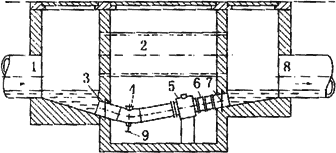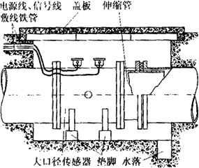 由于大口徑管道在多數(shù)場(chǎng)合下是埋在地下的,因此大口徑傳感器在安裝前應(yīng)做好水泥地坑。圖6-19所示是在給排水系統(tǒng)中常見(jiàn)的安裝形式。水泥地坑應(yīng)有足夠的活動(dòng)空間,側(cè)壁埋有敷設(shè)電纜的鋼管,上有蓋板防止雨淋,下有泄水管以免坑內(nèi)積水而使傳感器侵水。為了拆裝方便,傳感器應(yīng)放在墊腳上,且在下游側(cè)裝有活絡(luò)的伸縮管。圖6-20是熱水流量計(jì)在地下水泥管污水排放系統(tǒng)中的安裝實(shí)例。