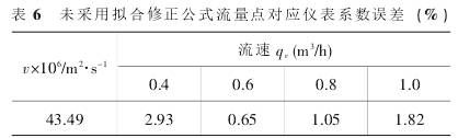 為證明該高粘度變流速自適應(yīng)算法及公式的有效性,重新選取四個(gè)流量點(diǎn):0.4m3/h、0.6m3/h、0.8m3/h、1.0m3/h對(duì)該公式以及算法進(jìn)行精度驗(yàn)證,得到表4數(shù)據(jù),表5為各對(duì)應(yīng)流量點(diǎn)的擬合后儀表系數(shù)的誤差。