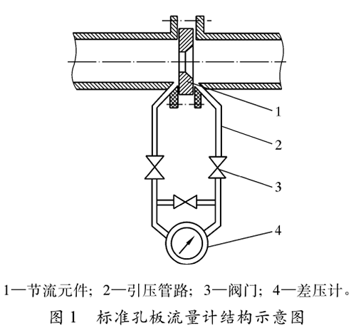 標(biāo)準(zhǔn)管道空氣流量計(jì)結(jié)構(gòu)如圖1所示,包括節(jié)流元件(標(biāo)準(zhǔn)孔板及其取壓裝置)、傳輸壓差信號(hào)的引壓管路、閥門以及差壓計(jì)等部分。標(biāo)準(zhǔn)孔板是壓差測(cè)量時(shí)的一次元件,人們利用它在管道內(nèi)使流體產(chǎn)生壓差,再通過(guò)引壓管路把孔板前、后產(chǎn)生的壓差傳送給差壓變送器,再輸人到二次儀表,從而顯示出管道內(nèi)流體的靜壓、壓差、瞬時(shí)流量和累計(jì)流量等計(jì)量參數(shù)。
