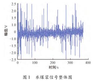 針對(duì)管道式水流量計(jì)測(cè)量水煤漿時(shí)出現(xiàn)較大波動(dòng),甚至回零這一問(wèn)題,特去某煤化工企業(yè)甲醇分公司進(jìn)行現(xiàn)場(chǎng)數(shù)據(jù)采集。該公司所使用的對(duì)置式四噴嘴氣化有4個(gè)噴嘴,噴嘴管道口徑為125mm,管中水煤漿流量基本穩(wěn)定在19m³/h(流速約為0.48m/s)。每條噴嘴煤漿線上安裝了3臺(tái)管道式水流量計(jì),每臺(tái)管道式水流量計(jì)由傳感器和變送器兩部分組成。選擇其中1條水煤漿管線上的1臺(tái)管道式水流量計(jì)進(jìn)行數(shù)據(jù)采集,因?yàn)樵撆_(tái)管道式水流量計(jì)測(cè)量結(jié)果波動(dòng)大,甚至出現(xiàn)回零的現(xiàn)象。將課題組研制的基于DSP的電磁流量變送器的信號(hào)線和勵(lì)磁線接到該電磁流量傳感器的電極和勵(lì)磁線圈上,組合成完整的管道式水流量計(jì),進(jìn)行水煤漿數(shù)據(jù)采集。使用的電磁流量變送器是以TI公司DSP芯片TMS320F28335為核心,采用高頻勵(lì)磁方案,其硬件主要包括勵(lì)磁控制系統(tǒng)和信號(hào)采集處理系統(tǒng),具體的模塊有勵(lì)磁驅(qū)動(dòng)模塊、信號(hào)調(diào)理采集模塊、信號(hào)處理控制模塊、人機(jī)接口模塊、通信模塊及電源管理模塊。信號(hào)調(diào)理采集模塊中的調(diào)理電路對(duì)一次儀表輸出的信號(hào)進(jìn)行放大和濾波,截止頻率是2kHz,放大倍數(shù)約為230倍。通過(guò)NI公司USB-6216型號(hào)的數(shù)據(jù)采集卡進(jìn)行數(shù)據(jù)采集,把調(diào)理電路的輸出端連接到數(shù)據(jù)采集卡的一個(gè)差分輸入端,并設(shè)置數(shù)據(jù)采集卡工作在差分的測(cè)量模式,設(shè)置采集卡的采樣頻率為10kHz。采集多組水煤漿信號(hào)數(shù)據(jù),每組數(shù)據(jù)的時(shí)間長(zhǎng)度為5min。