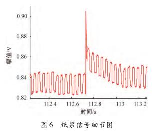 為了進(jìn)一步研究水煤漿信號(hào)的特點(diǎn),將其與紙漿信號(hào)進(jìn)行對(duì)比。通過(guò)分析課題組采集的25Hz矩形波勵(lì)磁下的紙漿信號(hào)發(fā)現(xiàn),在同樣流速下,測(cè)量介質(zhì)為紙漿時(shí),傳感器輸出信號(hào)經(jīng)調(diào)理放大后能明顯看到與流量相關(guān)的感應(yīng)電動(dòng)勢(shì)信號(hào),且其漿液干擾僅為數(shù)十毫伏,要遠(yuǎn)小于水煤漿信號(hào)中的漿液干擾,如圖5所示。對(duì)圖5所示的紙漿信號(hào)進(jìn)行局部放大,得到如圖6所示的信號(hào)??梢?jiàn),紙漿信號(hào)中的漿液干擾持續(xù)的時(shí)間也遠(yuǎn)小于水煤漿信號(hào)中的漿液干擾,且頻率較低。