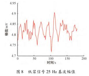 在頻域中對(duì)紙漿信號(hào)觀察時(shí)發(fā)現(xiàn),紙漿信號(hào)的漿液噪聲頻帶在零頻率點(diǎn)附近,距離流量信號(hào)基波頻率點(diǎn)較遠(yuǎn),對(duì)基波幅值和各奇次諧波幅值基本沒(méi)有影響,紙漿信號(hào)在頻域中的圖形如圖7所示。選擇一組采集的紙漿信號(hào),把其等分成數(shù)段,利用MATLAB計(jì)算每段數(shù)據(jù)在基波處的幅值并提取保存在一個(gè)數(shù)組中,使用繪圖工具畫出來(lái),如圖8所示??梢?jiàn),基波幅值在4.7~4.95mV變化,波動(dòng)較小。因此,提取到的與流量相關(guān)的感應(yīng)電動(dòng)勢(shì)信號(hào)幅值會(huì)比較穩(wěn)定。