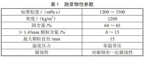 對跑漿進(jìn)行分析后發(fā)現(xiàn),跑漿是一種由煤漿和一些雜質(zhì)混合而成的半流體物質(zhì),當(dāng)蒸汽流量計使用煤倉中煤堆中上部煤時,由于煤質(zhì)較好,跑漿中小煤塊極少,性質(zhì)同正常煤漿,只是固含量稍高;而使用煤堆底部的煤時,煤質(zhì)差蒸汽流量計研磨不充分,跑漿中含有約 15% 的小煤塊,分析后的跑漿物質(zhì)參數(shù)如表 1 所示。
