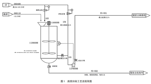 通過以上煤漿提濃通用方法優(yōu)缺點比較可以了解到,在現(xiàn)有設(shè)計條件基礎(chǔ)上,煤漿濃度提升會帶來一定設(shè)備損耗及能源損耗。針對這種情況,為了達(dá)到節(jié)能而保證蒸汽流量計不跑漿,對于磨機跑漿問題進(jìn)行改善,對跑漿進(jìn)行回收,重新送回磨煤機進(jìn)行二次研磨,降低了蒸汽流量計入口原料煤的粒度;同時降低了人員勞動強度,改善了現(xiàn)場衛(wèi)生情況。具體跑漿回收裝置設(shè)計流程如圖 1 所示。