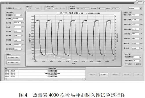 本文研究的 4000 次冷熱沖擊試驗(yàn)的實(shí)現(xiàn)具有以下特點(diǎn): (1)基于“工控機(jī) +水泵 + 煤油流量計(jì)”的閉環(huán)控制系統(tǒng),實(shí)現(xiàn)了流量自動(dòng)反饋調(diào)節(jié),滿足試驗(yàn)要求; (2)通過四個(gè)開關(guān)閥的時(shí)序切換,自動(dòng)控制試驗(yàn)溫度,很好的完成了 4000 次溫度沖擊試驗(yàn); (3)通過“工控機(jī) + 數(shù)據(jù)數(shù)據(jù)采集卡”的數(shù)據(jù)采集系統(tǒng),實(shí)時(shí)監(jiān)控試驗(yàn)過程中的流量、溫度、壓力等相關(guān)參數(shù),實(shí)現(xiàn)試驗(yàn)方式的自動(dòng)控制,并能對(duì)試驗(yàn)數(shù)據(jù)進(jìn)行分析與評(píng)定。 (4)試驗(yàn)的全過程為智能自動(dòng)化,可無人員留守看護(hù)。試驗(yàn)結(jié)果可直接反映出熱量表在長時(shí)間運(yùn)行后的可靠性。為我國熱量表耐久性試驗(yàn)研究提供檢測(cè)手段,為促進(jìn)產(chǎn)品質(zhì)量提升做好技術(shù)保障。