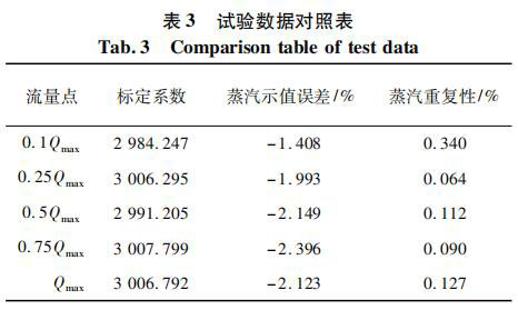 測試對象為同一臺表,DN80 口徑,帶有在空氣標定裝置上的 5 點標定系數(shù)。將管道介質(zhì)設定為過熱蒸汽,并預設溫度為 160 ℃ 和壓力 0. 4 MPa,以便儀表計算過熱蒸汽的密度。試驗數(shù)據(jù)對照如表 3 所示。