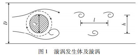 蒸汽流量計(jì)是由漩渦發(fā)生體、頻率檢測(cè)器和信號(hào)轉(zhuǎn)換器等環(huán)節(jié)組成,輸出 4 ~ 20 mADC 信號(hào)或脈沖電壓信號(hào)。其測(cè)量原理是在流動(dòng)的流體中的垂直流動(dòng)方向安放 1 根或多根非流體型阻流體,在一定的流量范圍內(nèi),流體在阻流體兩側(cè)交替地分離、釋放出 2 串頻率正比于管道內(nèi)的平均流速、規(guī)則的、不對(duì)稱有規(guī)律的交替漩渦列,如圖 1 所示,且兩側(cè)漩渦旋轉(zhuǎn)方向相反。采用檢測(cè)元件測(cè)出漩渦頻率就可以推算出流體的流量。