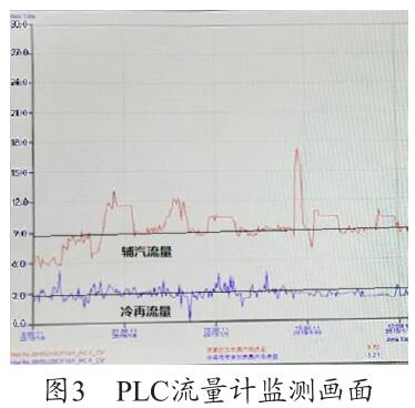 通過圖3可以看出,PLC 上輔汽測量用的氣體流量計的量程設(shè)置為30t/h,現(xiàn)場設(shè)備量程實際為5t/h,兩者嚴(yán)重不符,因此測量值8.286t/h 為錯誤值,需要對程序進行修改。