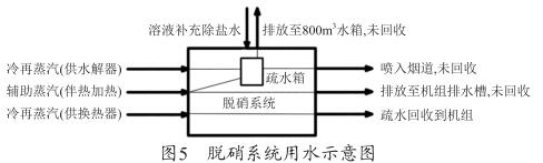 從圖5可以看出,脫硝系統(tǒng)所使用的冷再蒸汽和輔助蒸汽換熱后全部冷凝為疏水,供水解器的蒸汽和部分伴熱加熱的蒸汽回收至脫硝系統(tǒng)的疏水箱,部分伴熱蒸汽疏水直接排放至機組排水槽,未進行回收。疏水箱的水一部分被脫硝系統(tǒng)利用,另一部分排放至機組800m 3 水箱,未進行回收。下面結(jié)合耗水量對蒸汽耗量進行判斷 :