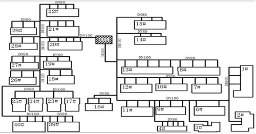 某小區(qū)住宅樓建設(shè)于1996年,建筑結(jié)構(gòu)為磚混建筑,建筑面積為54931m2,共30棟住宅樓。2017年繳費739戶,總采暖面積為47141m2。換熱站位于小區(qū)中部,板式換熱機組設(shè)計換熱面積為50000m2,循環(huán)泵額定功率為30kW,流量為200m³/h,揚程為32m。庭院管網(wǎng)共分為2個支狀供回水環(huán)路,該小區(qū)供熱管網(wǎng)見圖1所示。