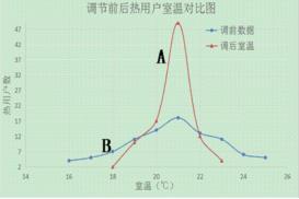我公司在該小區(qū)管網(wǎng)改造前,在不同單元不同樓層分別安裝100臺室溫采集器。渦街氣體流量計調(diào)前數(shù)據(jù)采集于2017~2018年供熱期,調(diào)后數(shù)據(jù)采集于2018~2019年供熱期。經(jīng)過兩個采暖期,共有96臺室溫采集器可以正常提供數(shù)據(jù)。數(shù)據(jù)分析結(jié)果見圖3所示。
