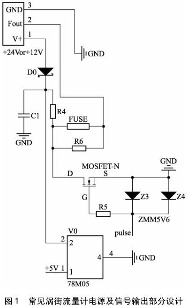 從圖1 中可以看到,供電電源 +24 V, +12 V均可,直流電源通過瓷片電容 C1 濾掉部分紋波,然后通過線性穩(wěn)壓芯片 78M05,得到 + 5 V 電壓,為后面的流量計信號處理電路供電,若要再得到 3. 3 V 電壓,通常會在 78M05 后再加一片線性穩(wěn)壓芯片 LM1117-3. 3,為了節(jié)約成本,供電電路沒有做 EMS 設(shè)計。同時,脈沖輸出部分,僅通過一個 MOS 管和兩個穩(wěn)壓管,也沒有 EMS 方面的設(shè)計考慮。